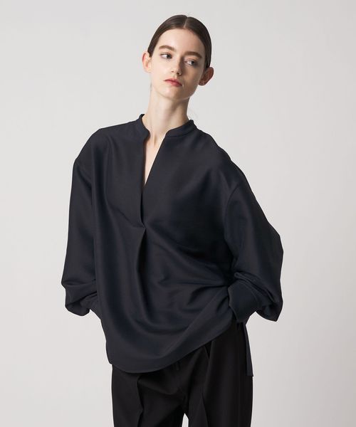 長め着丈のビッグシルエットを、深めの前開きと太めの袖で女性らしさを加えたブラウス。