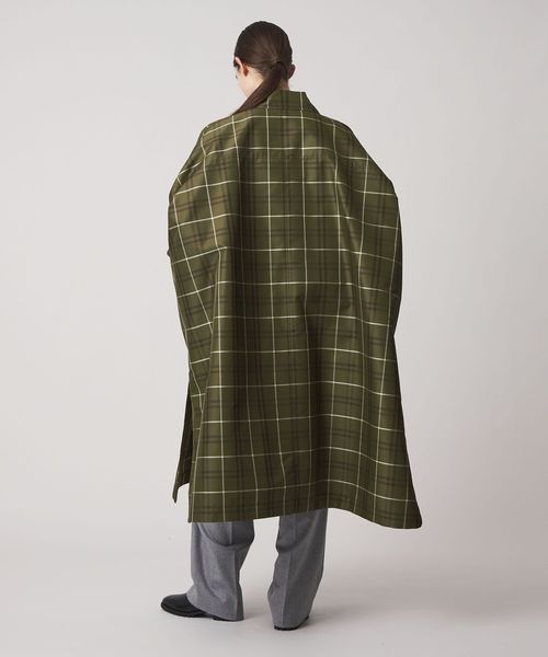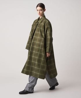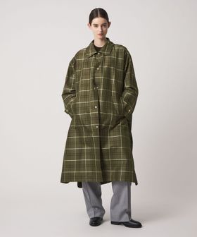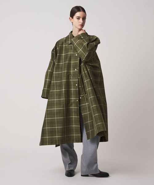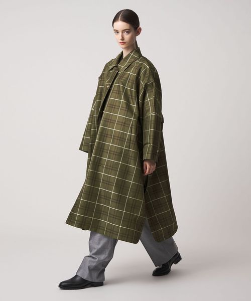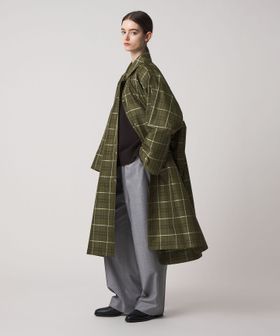カーキベースの大柄チェックが印象的なコート。