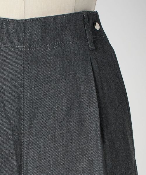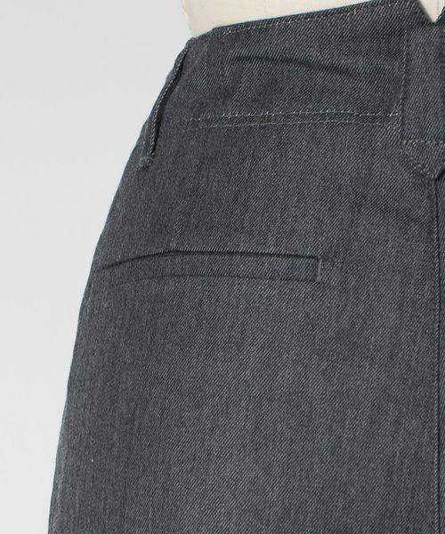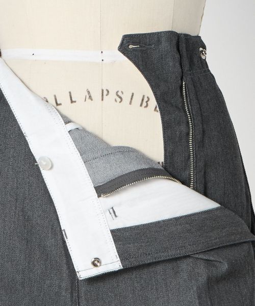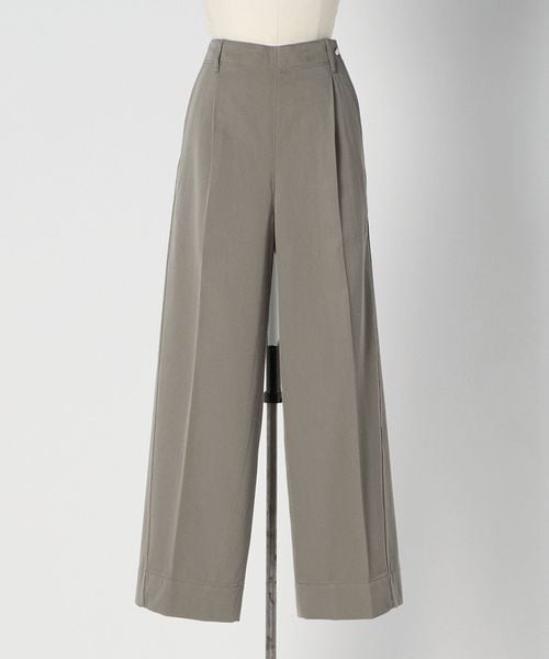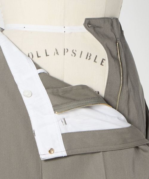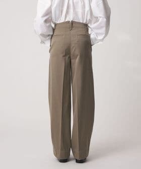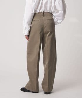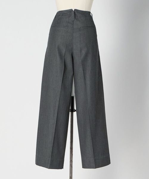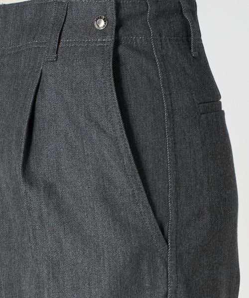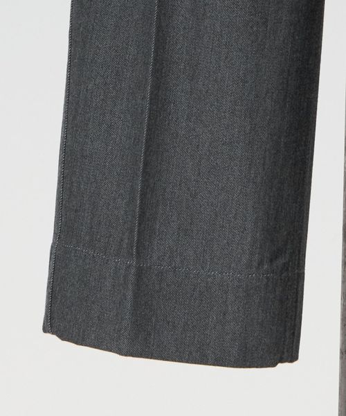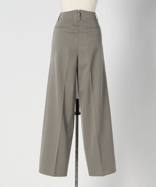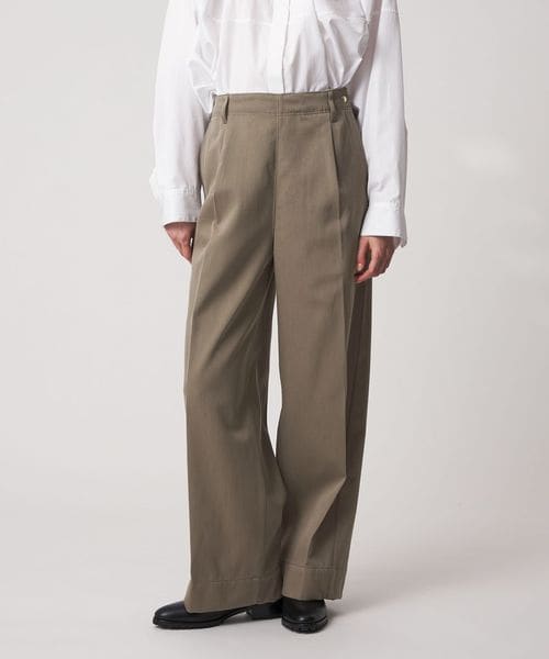左脇ポケットの奥にファスナー開きを配し、フロントをすっきりと見せたワンプリーツ入りのカーブパンツ。