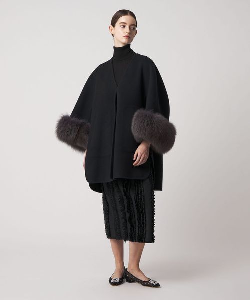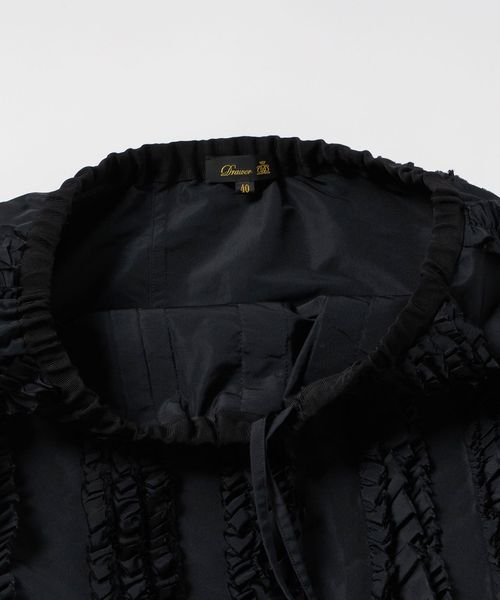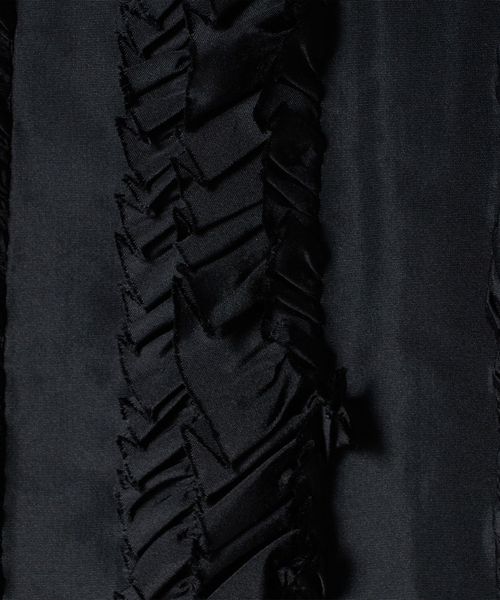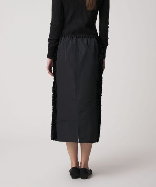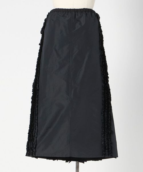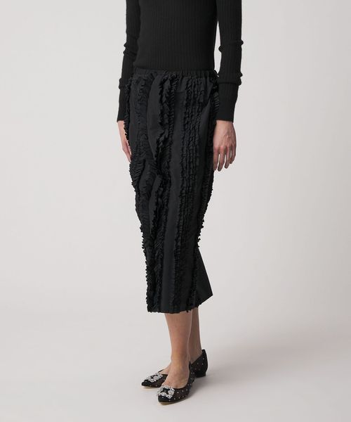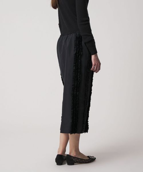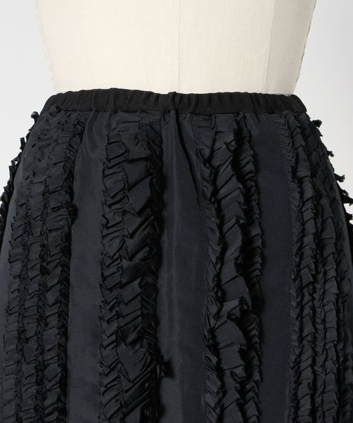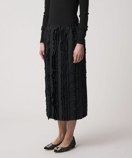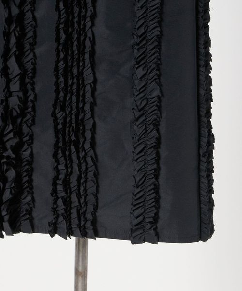 シンプルなタイトスカートに、贅沢にフリルをあしらったフェミニンでいてシックなデザインが特徴。