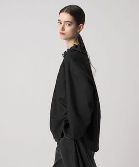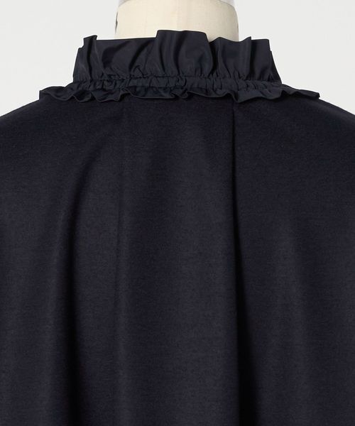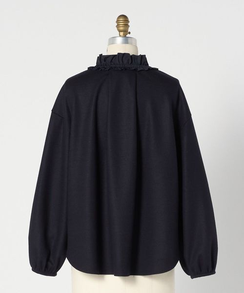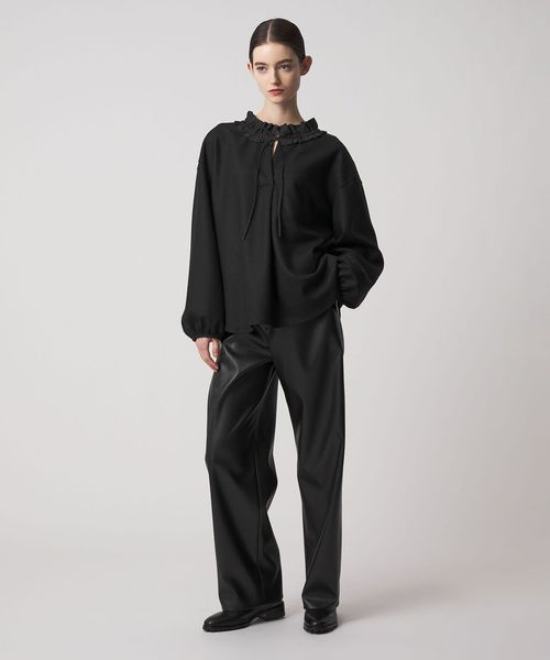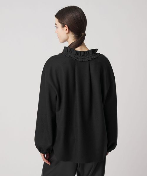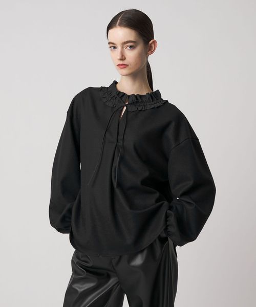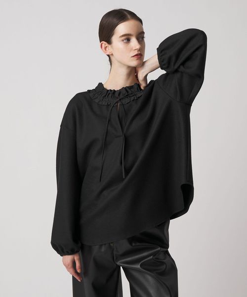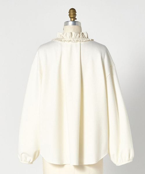 衿ぐりのフリルが華やかさを添えるブラウス。