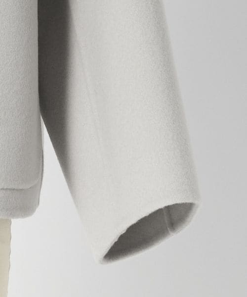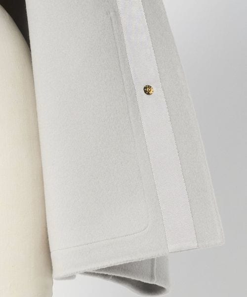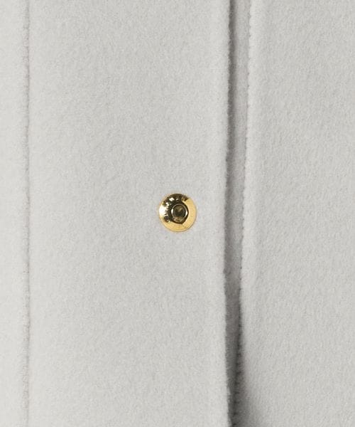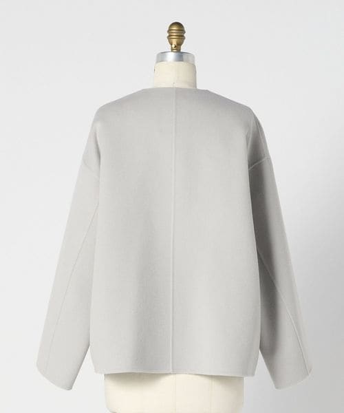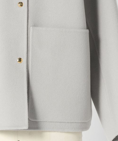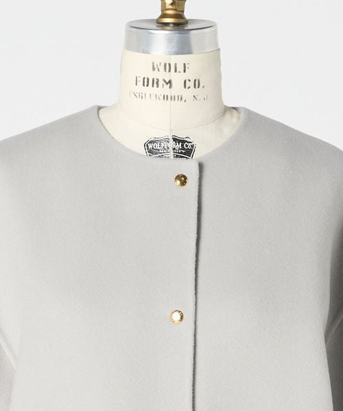 ノーカラーのシンプルなデザインにゴールドカラーのドットボタンがアクセントになったジャケット。