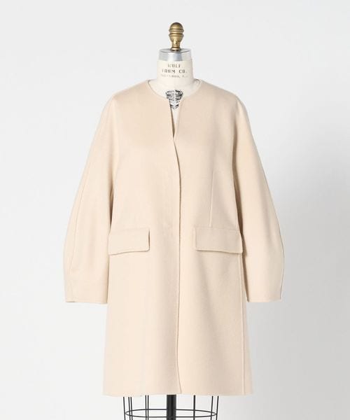 袖口に向かって緩やかに丸みを帯びたシルエットが、柔らかな印象を添えるノーカラーコート。