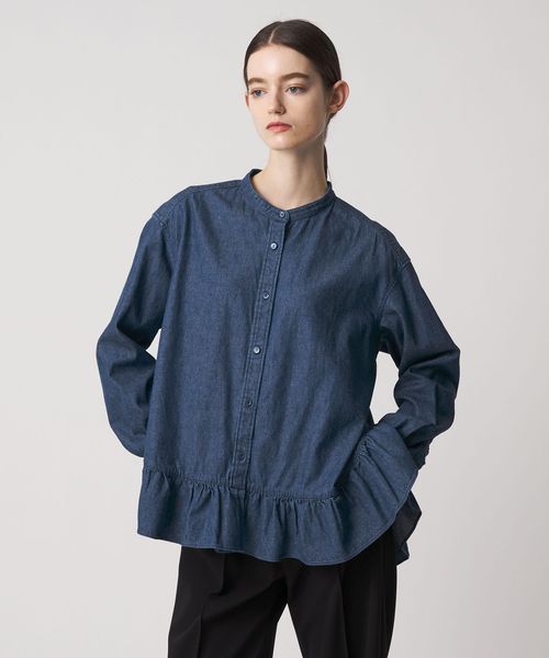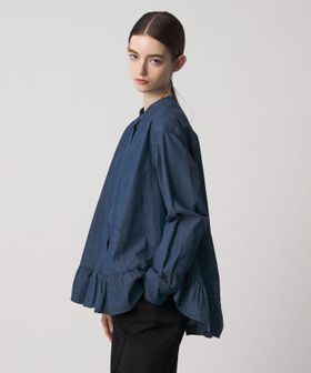 裾に施したカーブラインのラッフルが、動きと表情を添えるAラインのバンドカラーデニムシャツ。