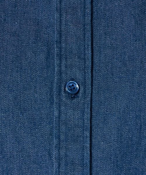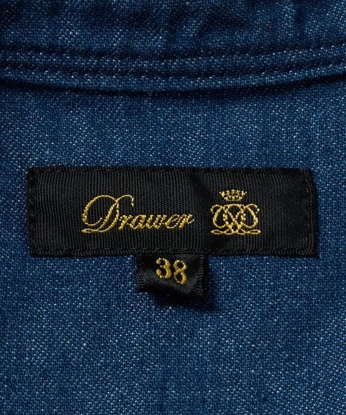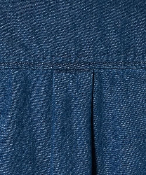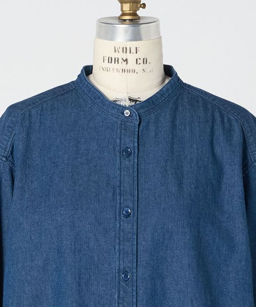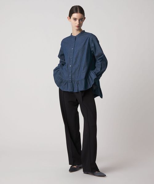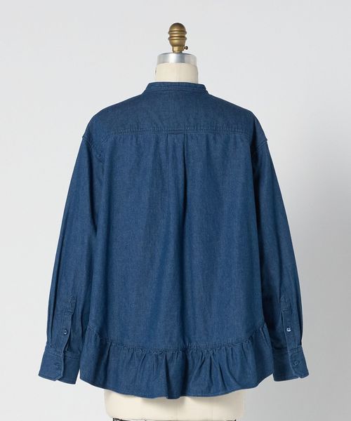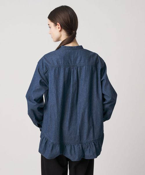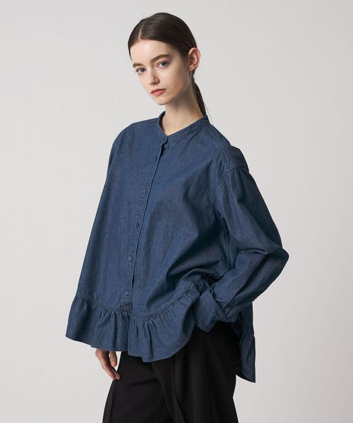 裾に施したカーブラインのラッフルが、動きと表情を添えるAラインのバンドカラーデニムシャツ。