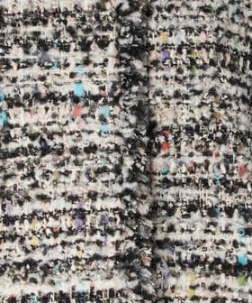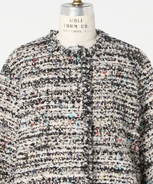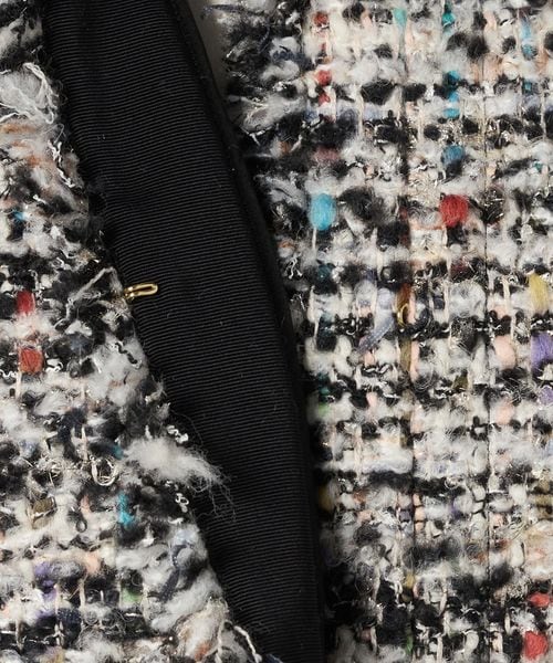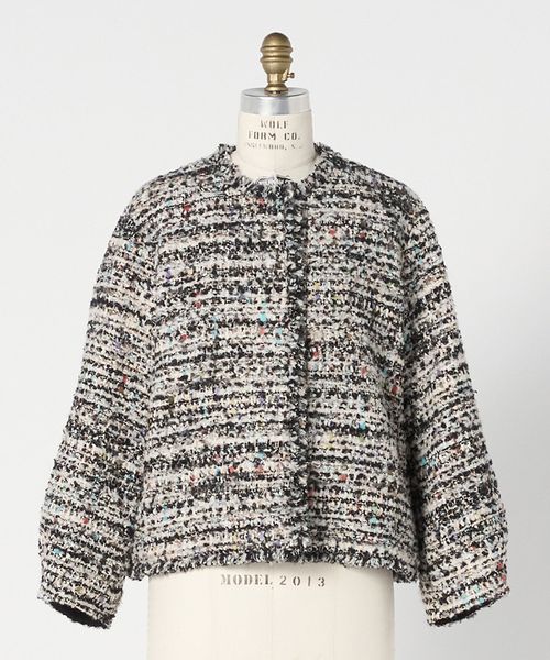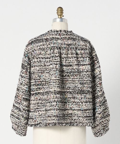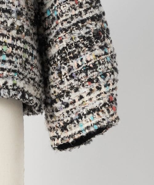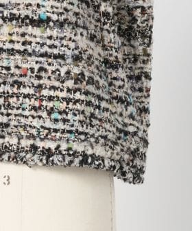 ラメ糸を織り込んだ多色使いの華やかなツィード生地で、 かろやかに仕上げたブラウスジャケット。