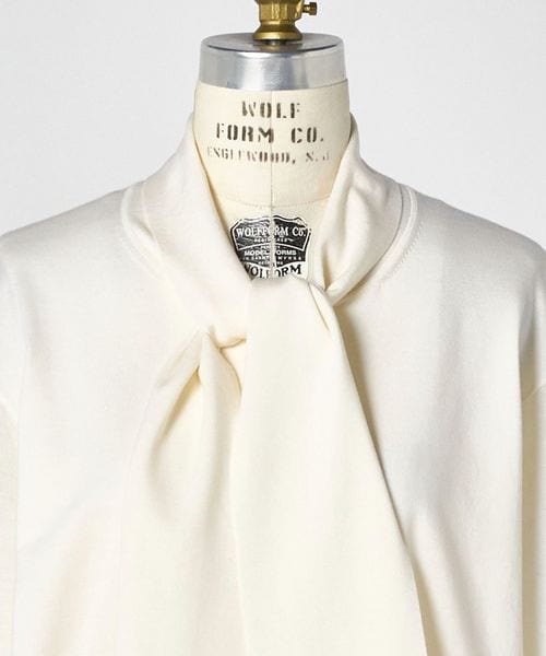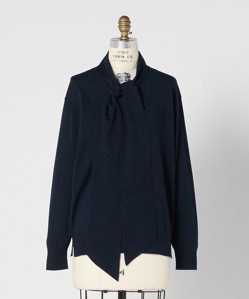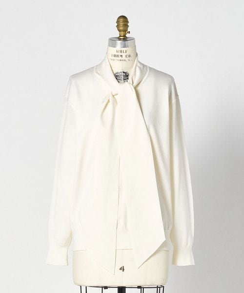 ネックからつながったボリューム感のあるボウタイリボンが上品に映えるプルオーバーニット。