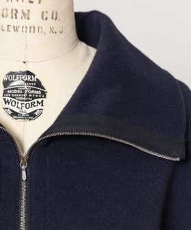 ジップを開ければ、衿を寝かせたときの大きなフォルムが美しく、着こなしに奥行きを与えるデザイン。