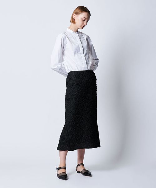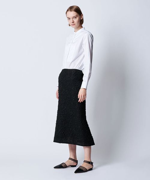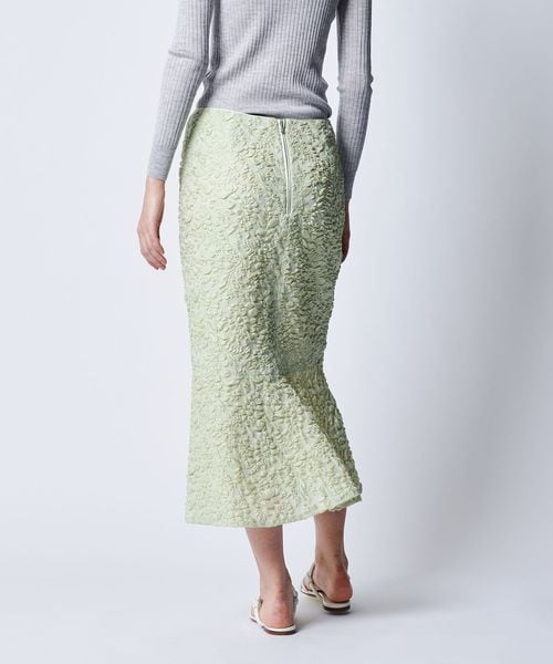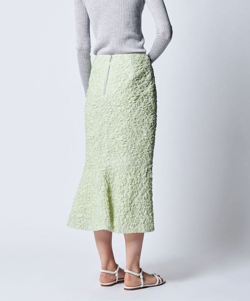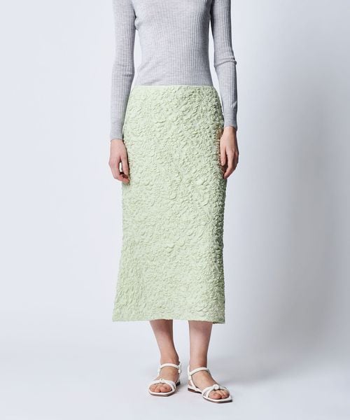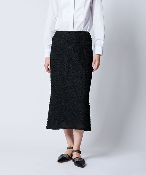 凹凸感ある華やかなジャガード素材が引き立つ、すっきりとしたタイトラインのスカート。