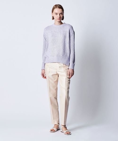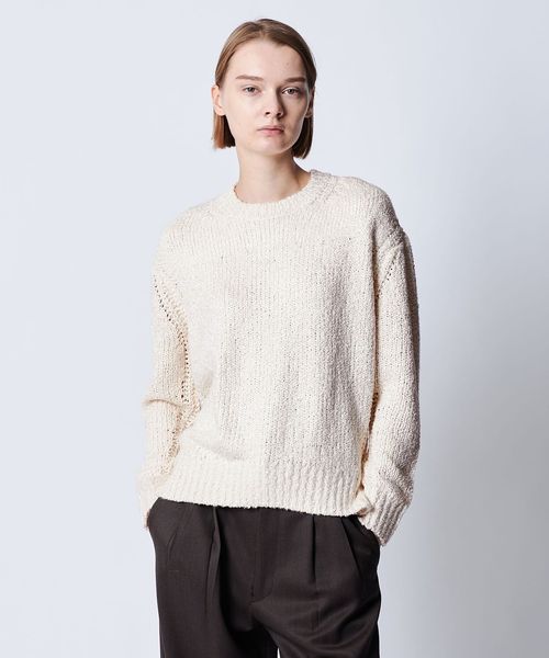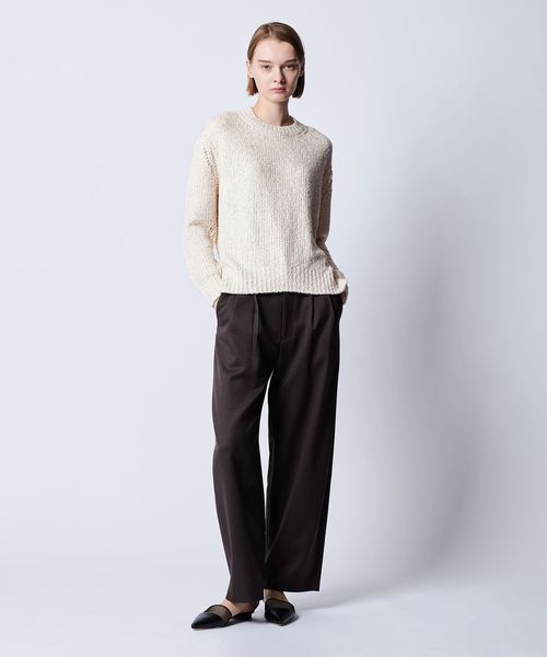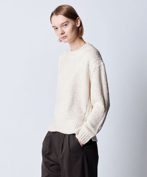 パンツ、スカートどちらにもスタイリングしやすいフォルムで仕上げたシンプルなプルオーバーニット。
