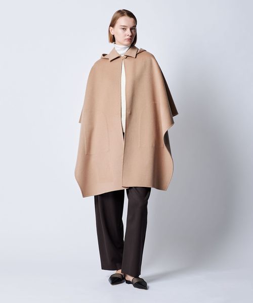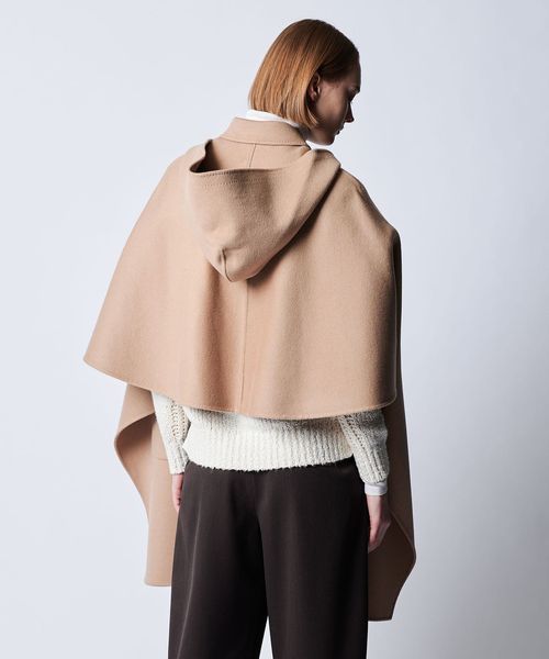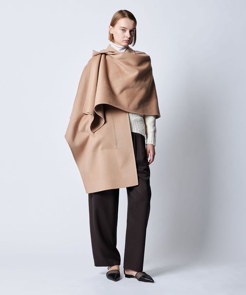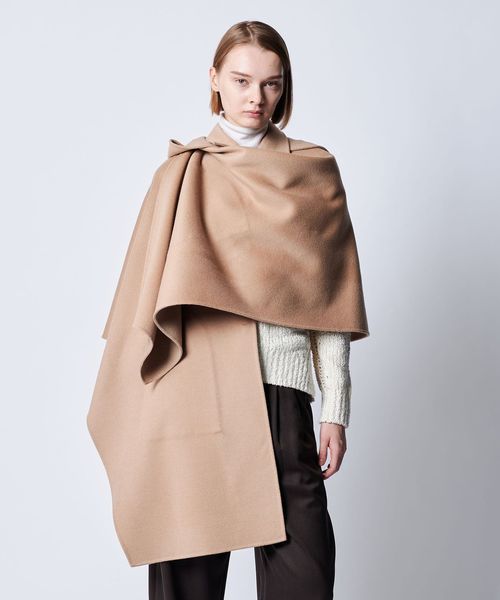 フロントからはストールを肩から掛けたようなデザイン、バックスタイルはフードのついたポンチョスタイルに見えるコート。