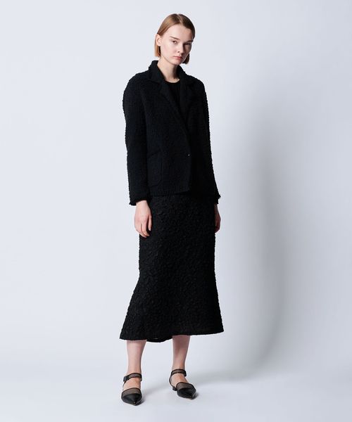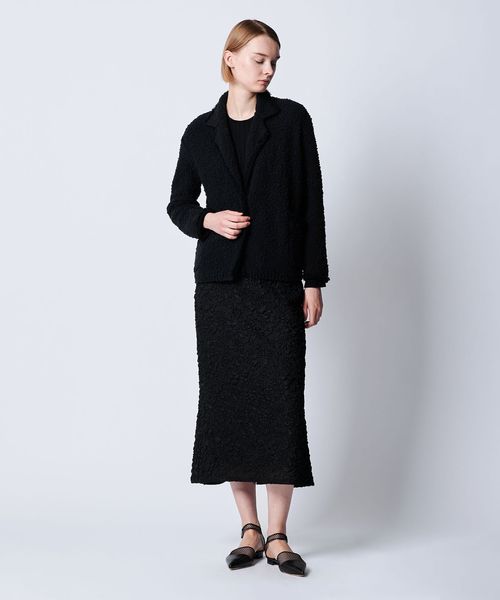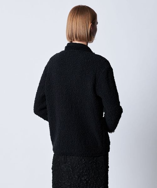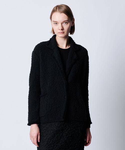 ツイードのような表情を持つニット素材を活かしたジャケットデザインのカーディガン。