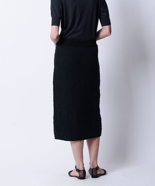 ツイードのような表情を持つ素材とペンシルラインがシャープな雰囲気に仕上げます。