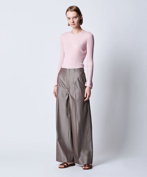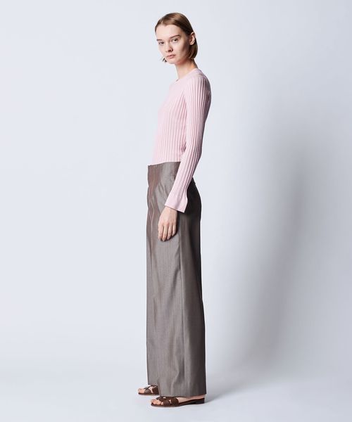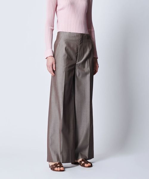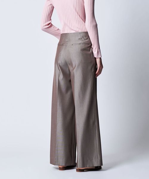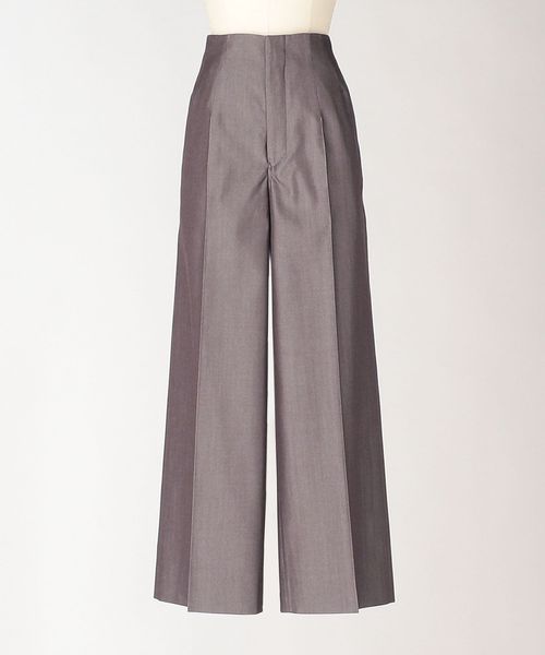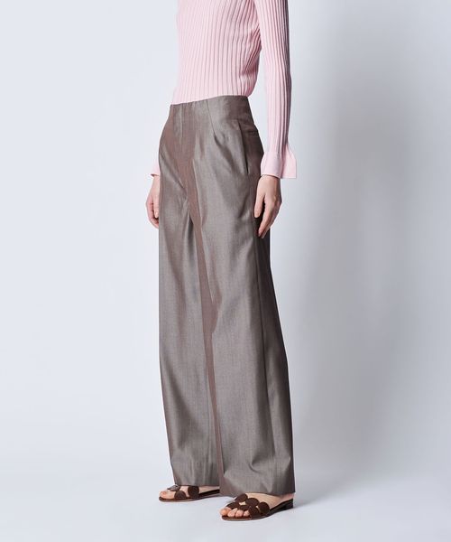 すっきりとしたフォルムのウェスト周りからゆるやかに広がるワイドラインが特徴のパンツ。