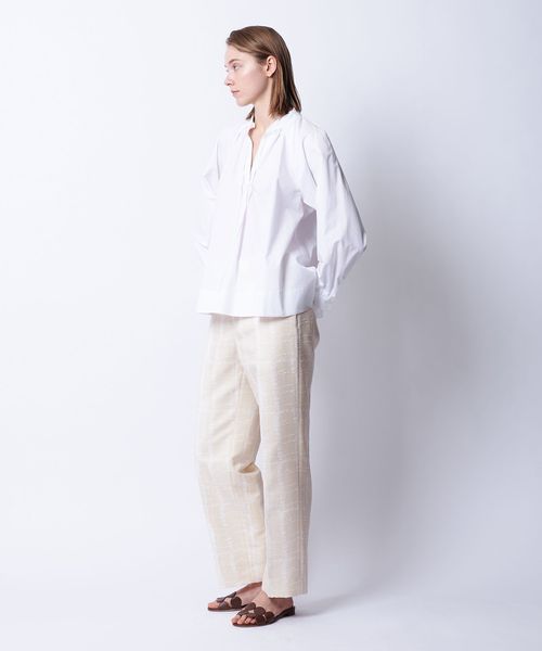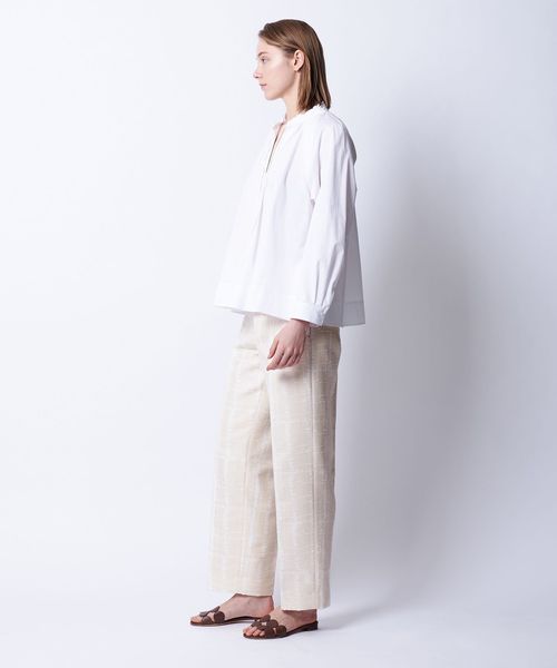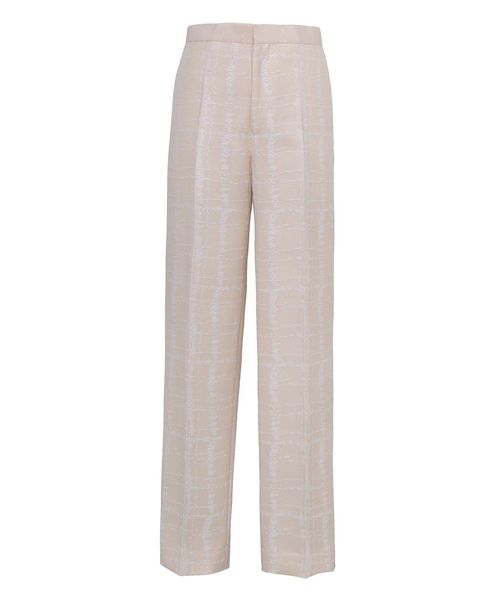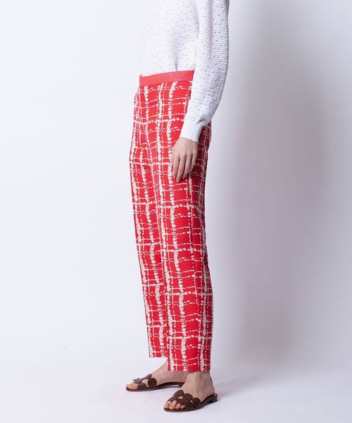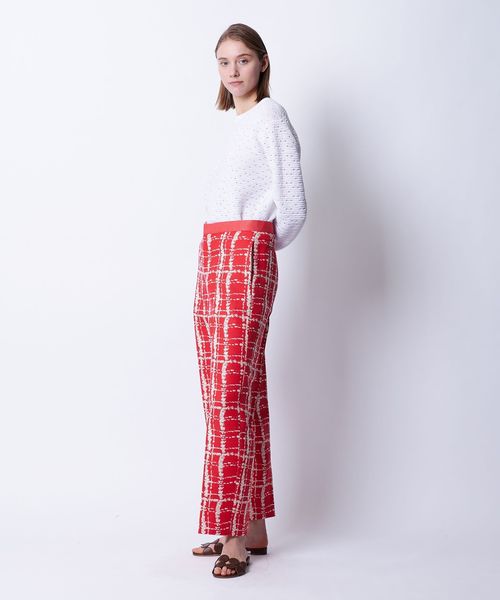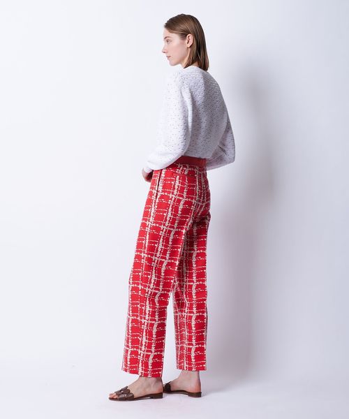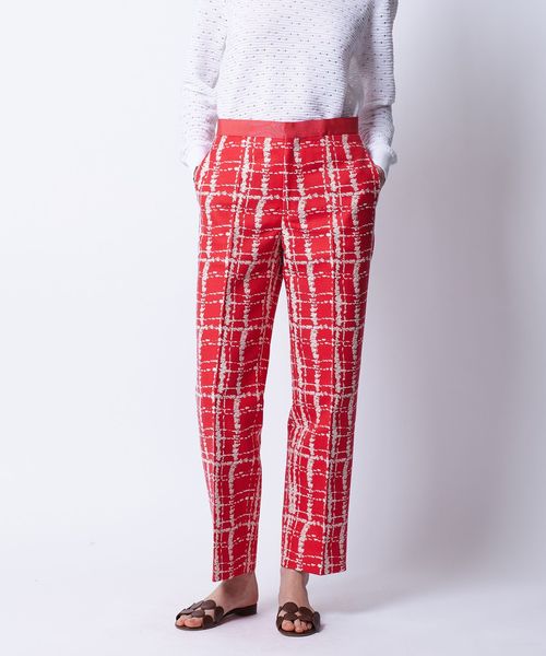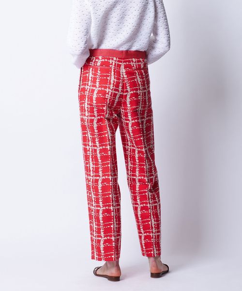 ジャガードで表現されたランダムなチェック柄が特徴のストレートパンツ