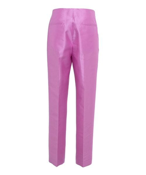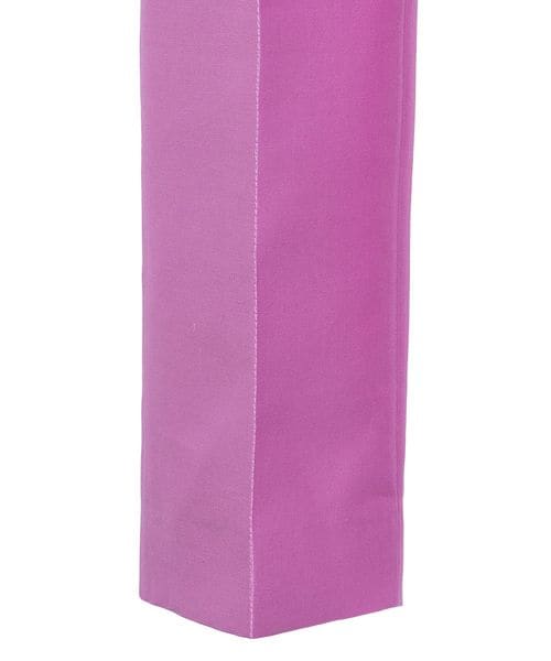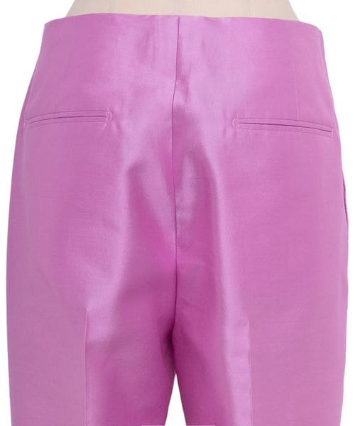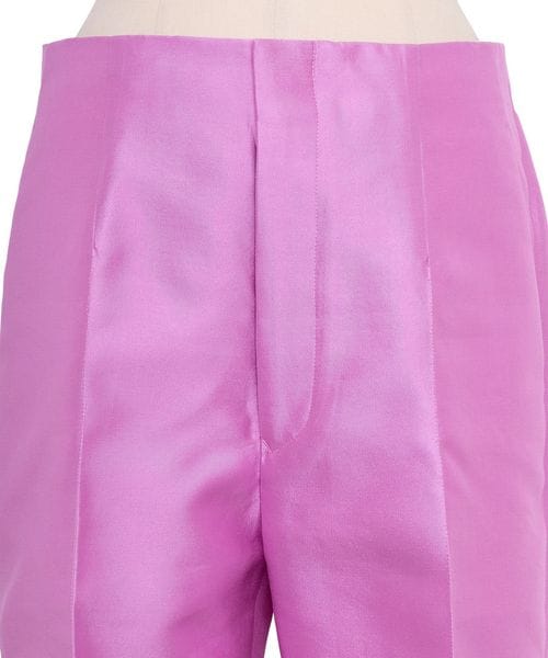 艶のある質感の発色のよいフーシャピンクのカラーリングが印象的なテーパードパンツ。