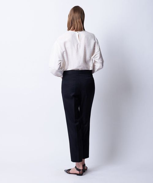 セレモニーシーンの着用も配慮し、ジャケットとセットアップで決まるフォルムとパンプスやローファーと合わせやすい丈感に仕上げています。