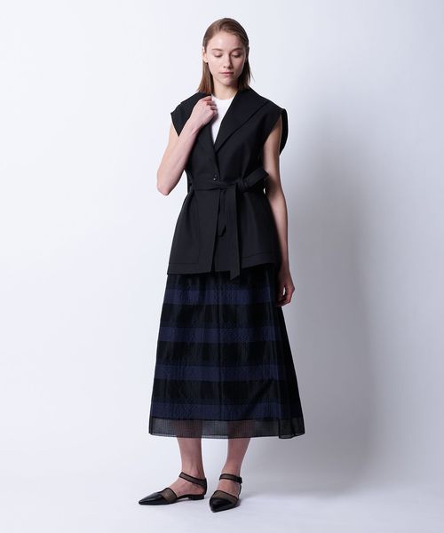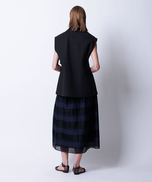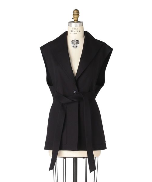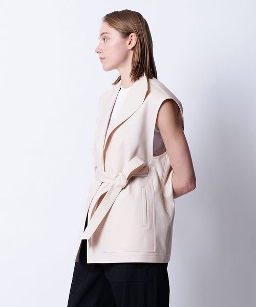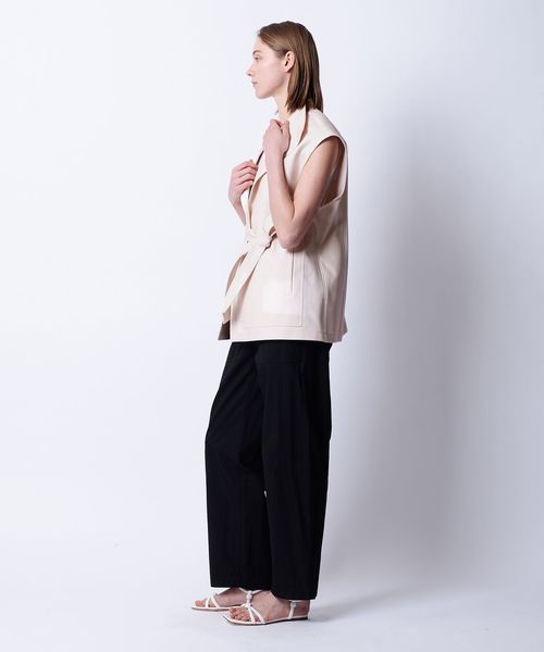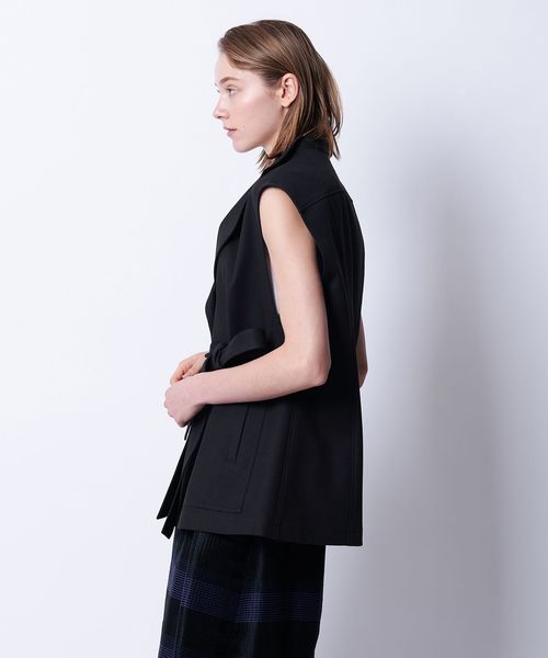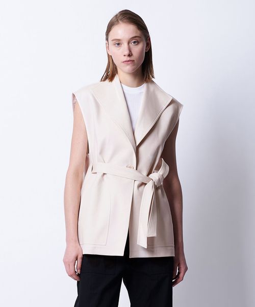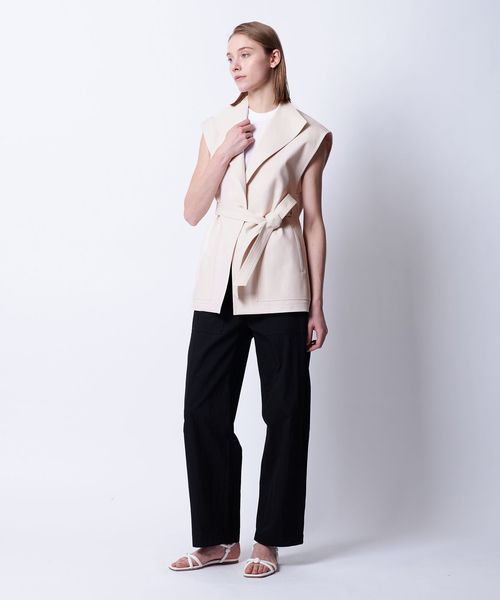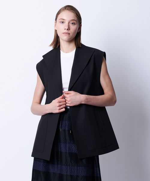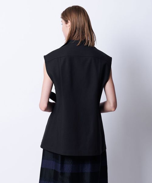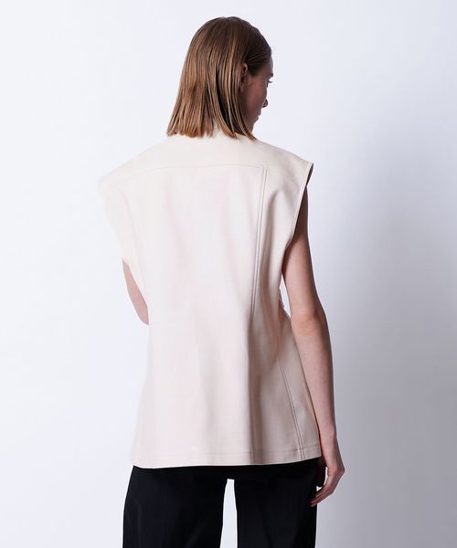 スタンド続きの返り衿のデザインがシャープでいて軽やかなコットンベースのジレ。