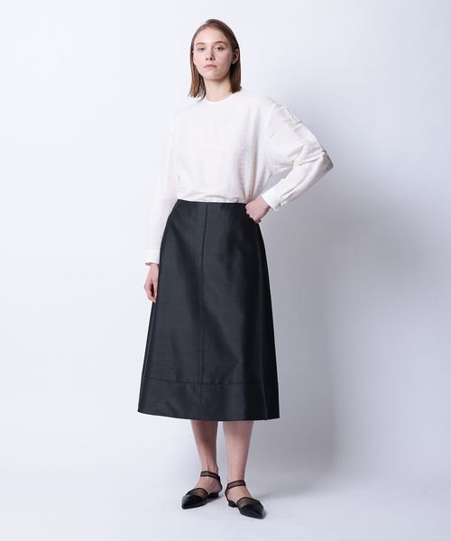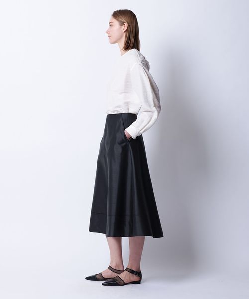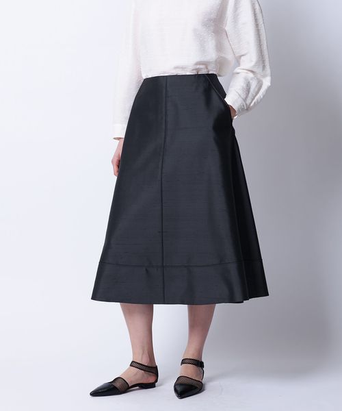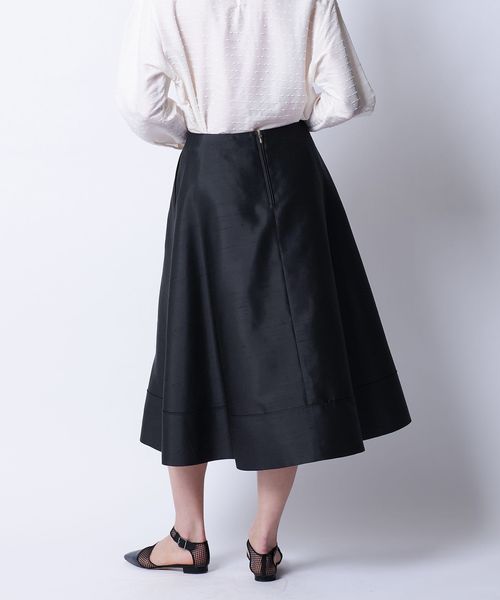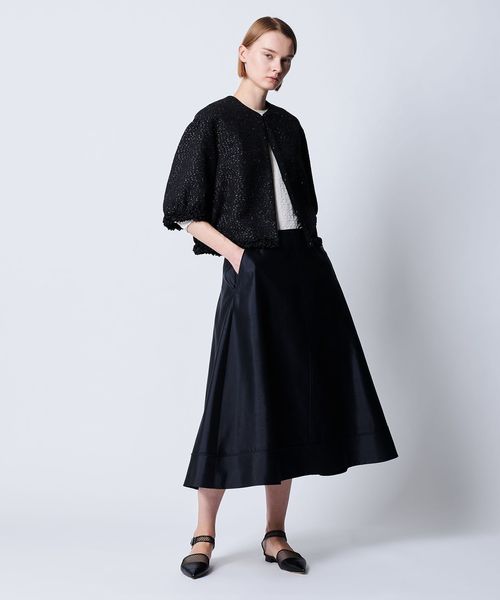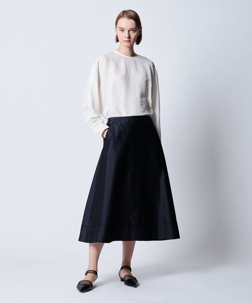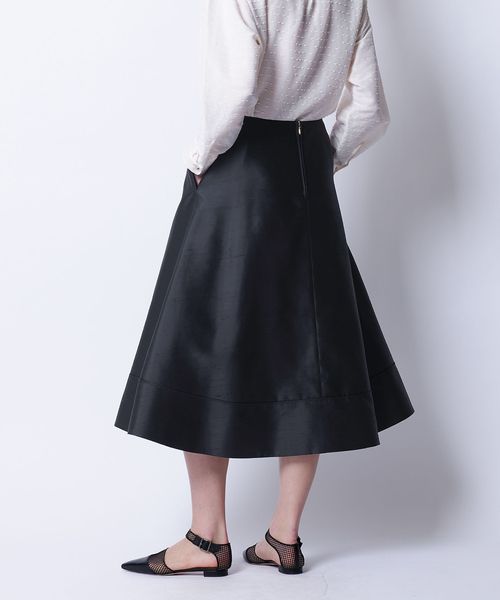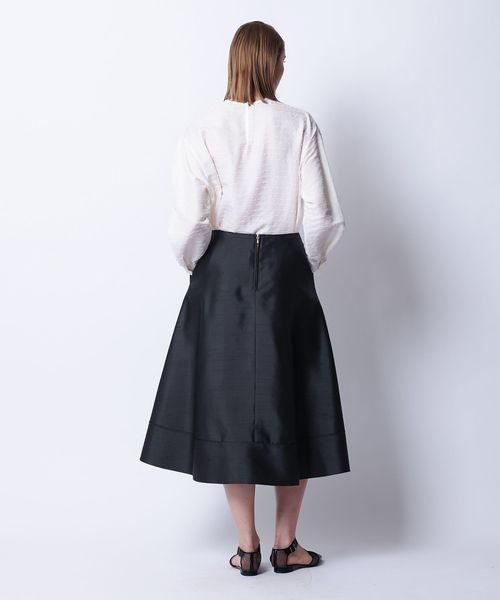素材が持つ張りを活かした華やかなフレアラインが美しいスカート。