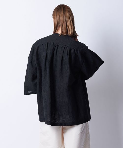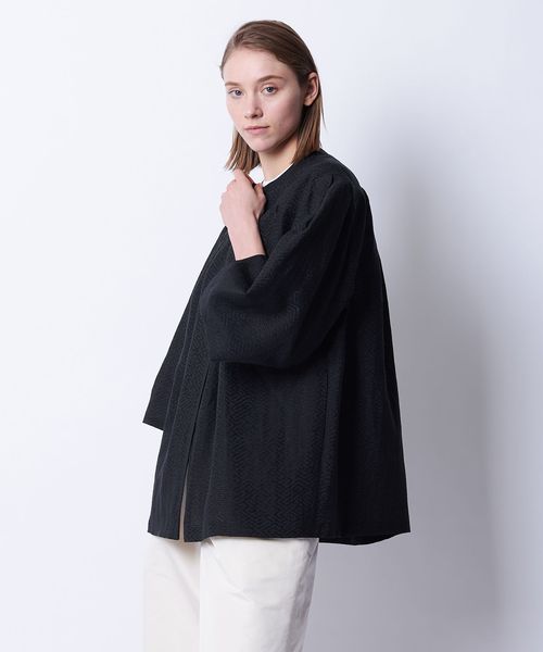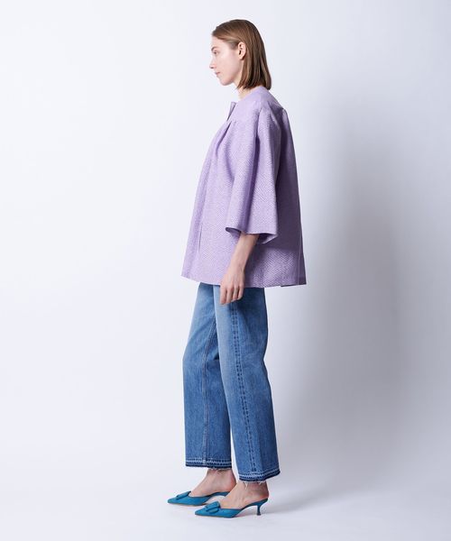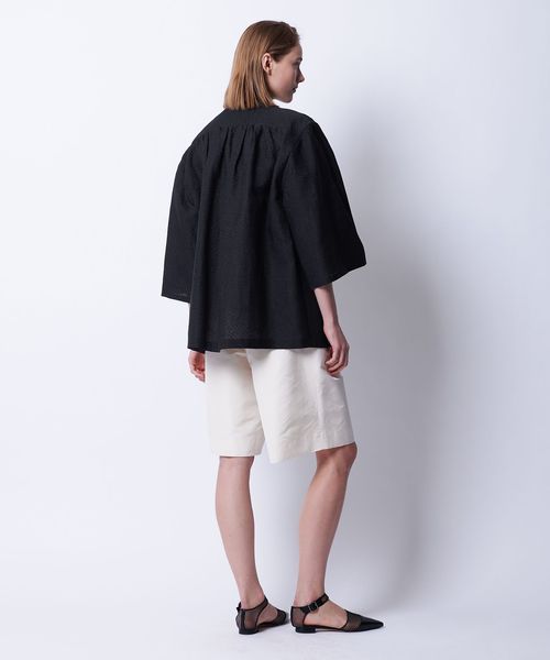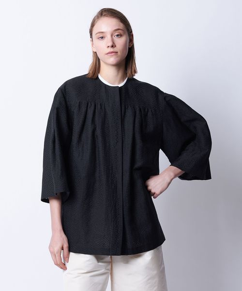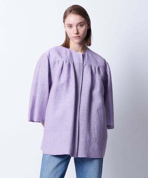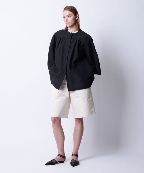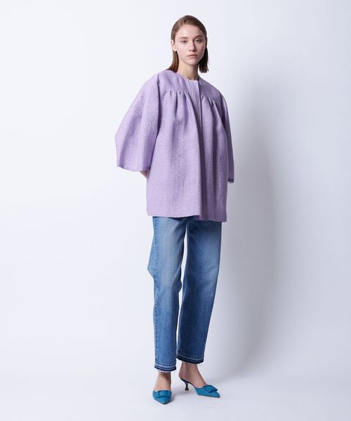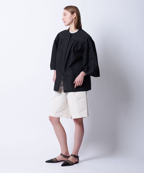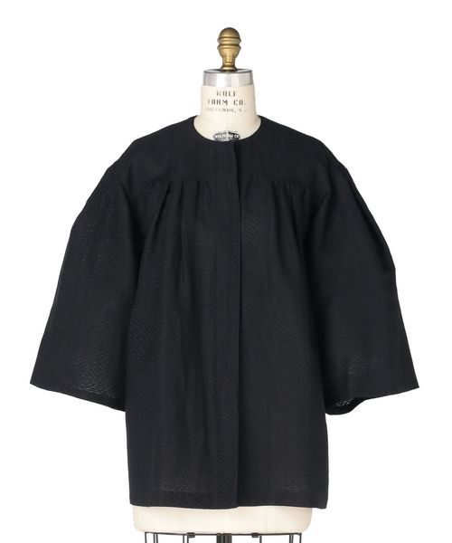ワイドなフレアスリーブとギャザーのつくる抜け感あるフォルムが軽やかなノーカラーコート。