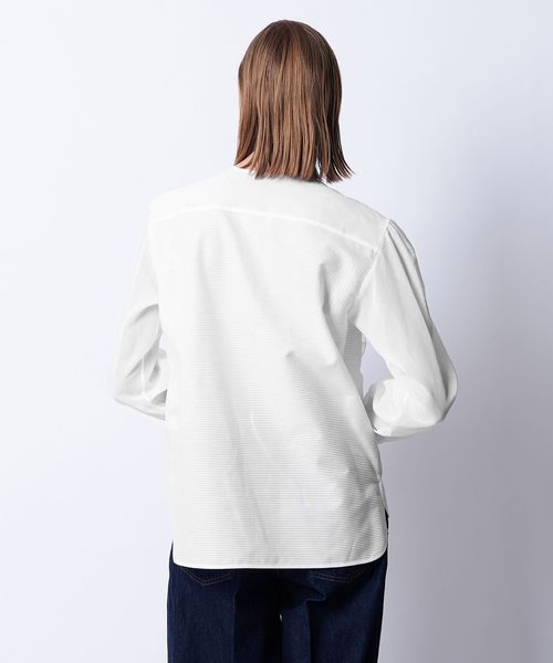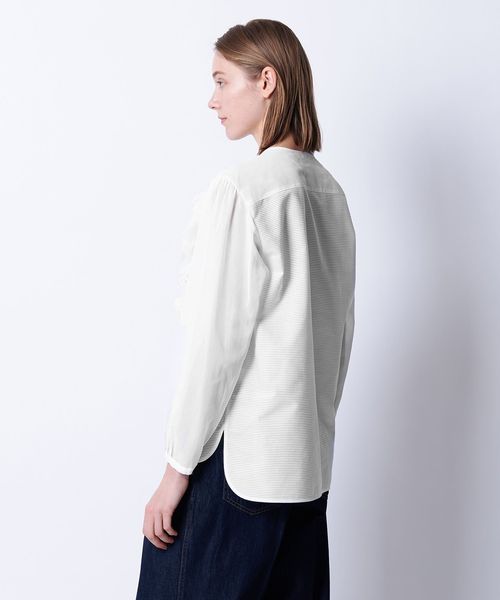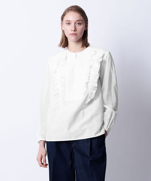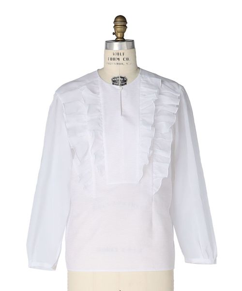 大きさやカッティングに配慮してリズミカルにデザインされたラッフルがポイントのブラウス。