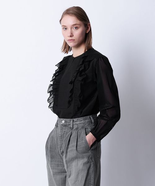 ランダムにあしらったラッフルフリルが華やかなシアーブラウス