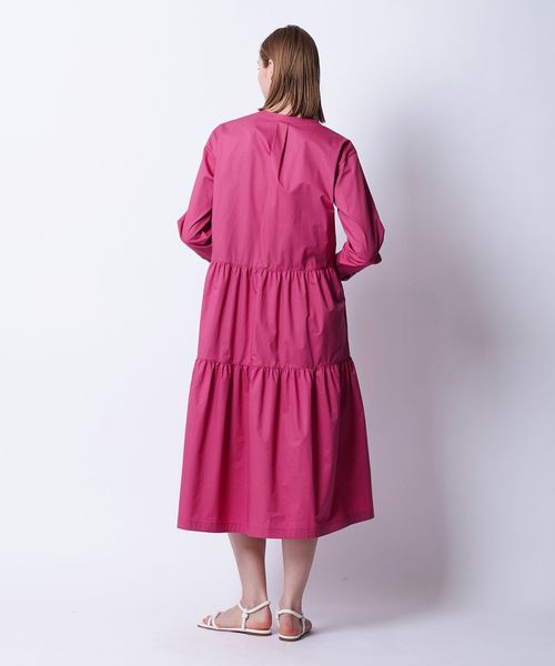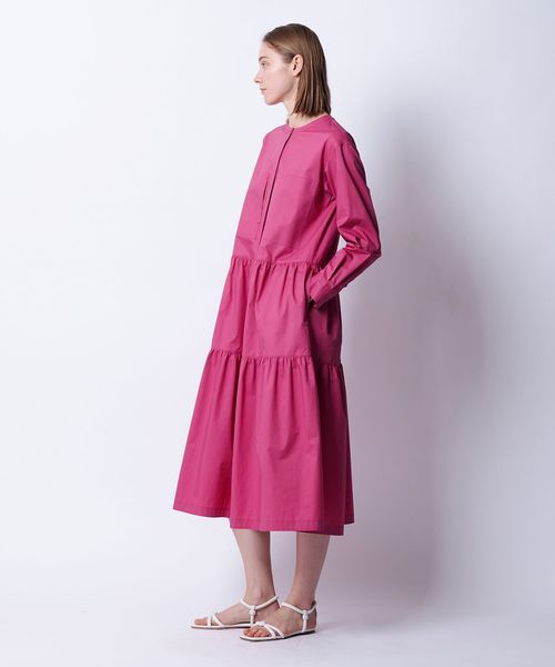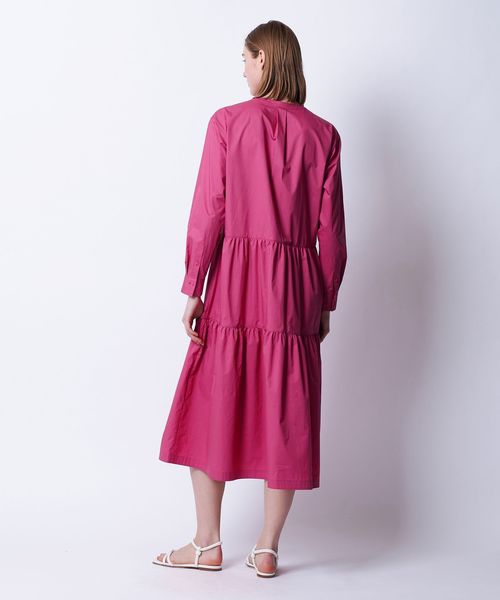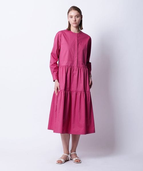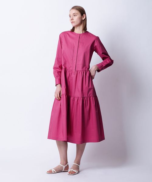 トップ部分はシャツデザインでシャープな印象、甘さのあるティアードデザインとのバランス感のよいロングスリーブワンピース。