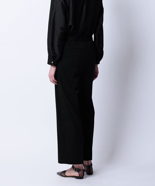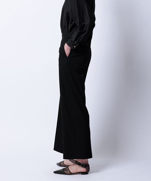 落ち感のある素材がつくるワイドシルエットがすっきりとした印象に仕上げるパンツ。