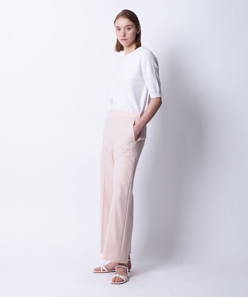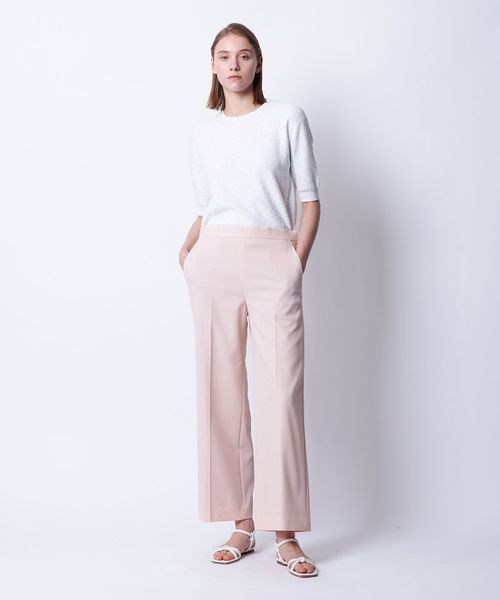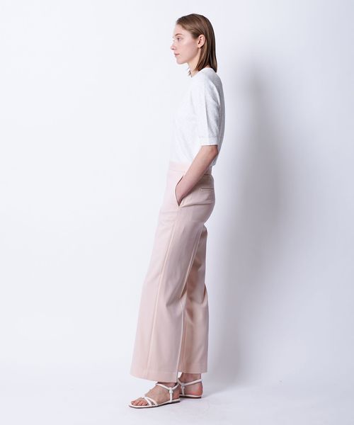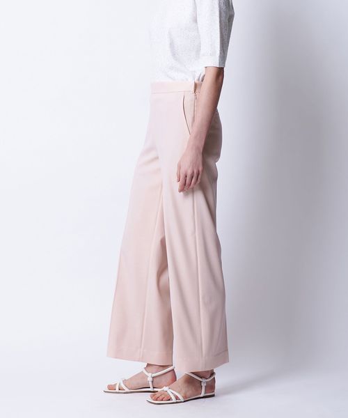 落ち感のある素材がつくるワイドシルエットがすっきりとした印象に仕上げるパンツ。