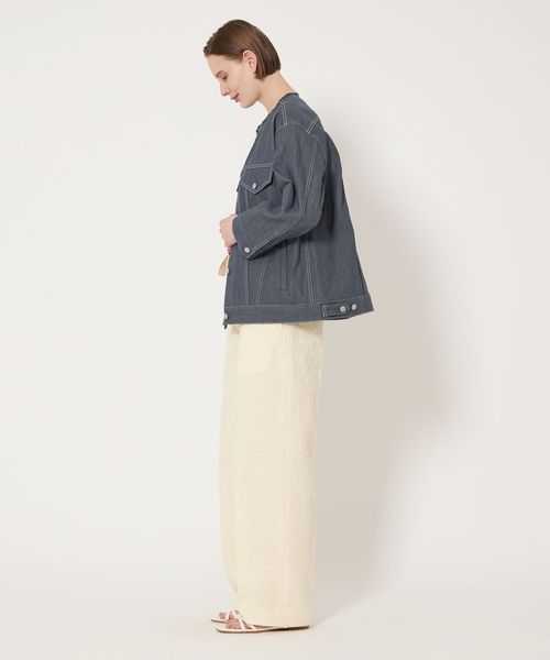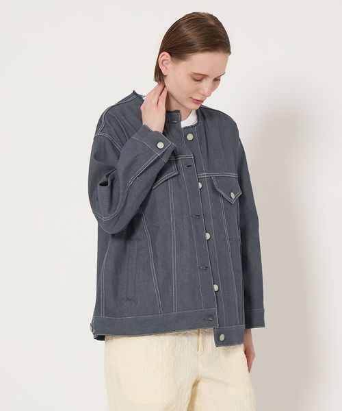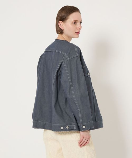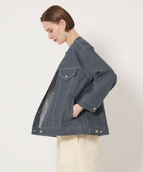 様々なスタイリングに合わせやすいオーバーサイジングのノーカラーデニムジャケット。