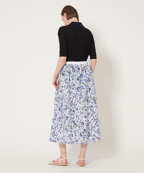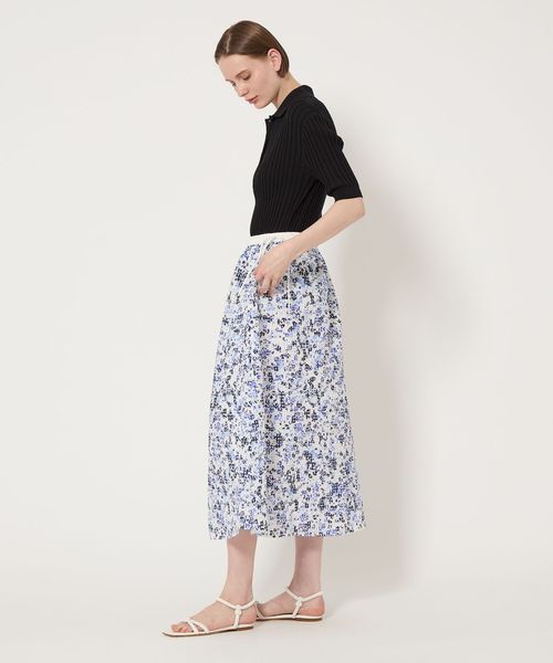 シアーなチェックとフラワーモチーフのコンビネーションが印象的なフレアラインのキャザースカート。