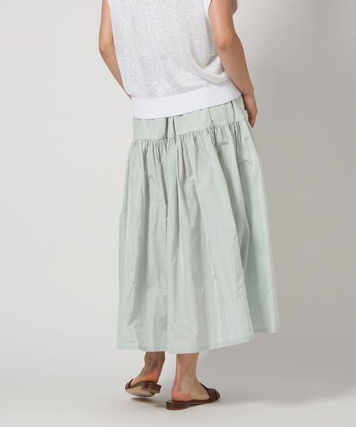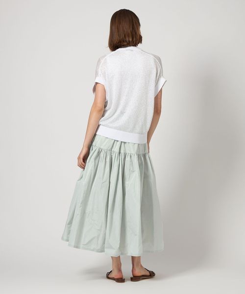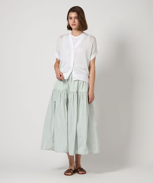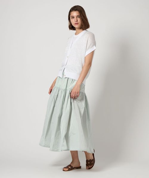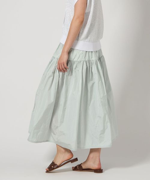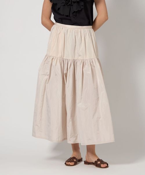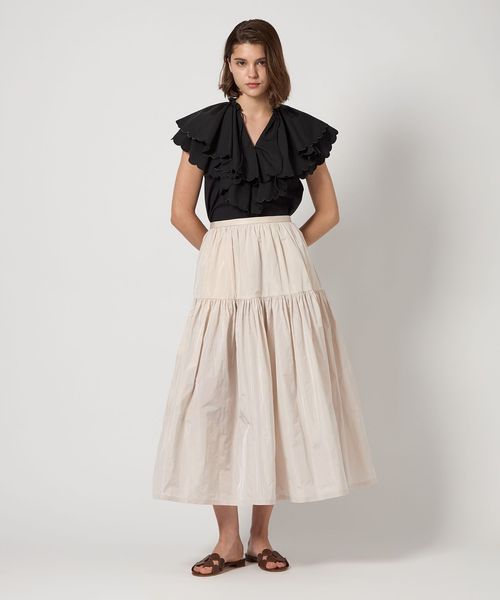 ウェストからヒップはすっきりめに、裾にはたっぷりとギャザーを施した切替デザインのティアードスカート。