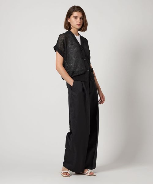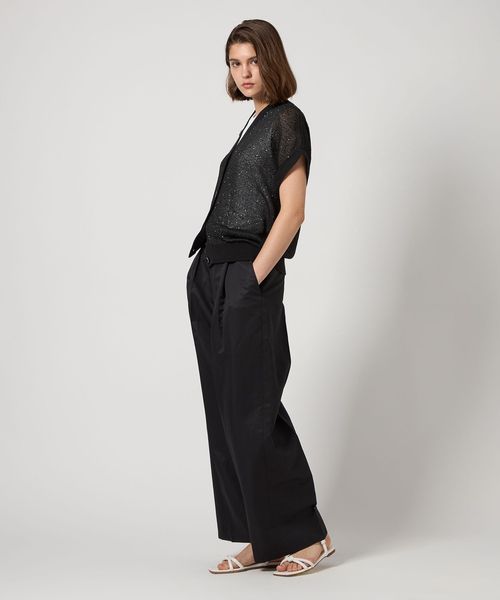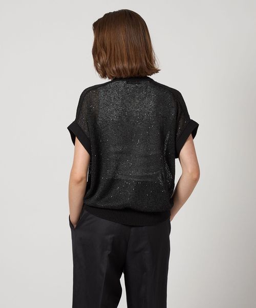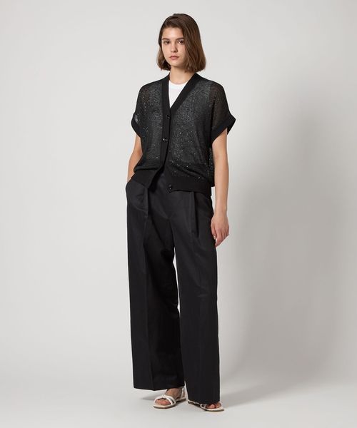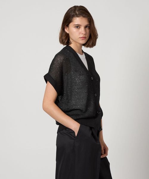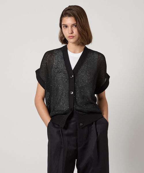清涼感のある生地に散りばめられたスパンコールが、上品な雰囲気を漂わせるショートスリーブのカーディガン。
