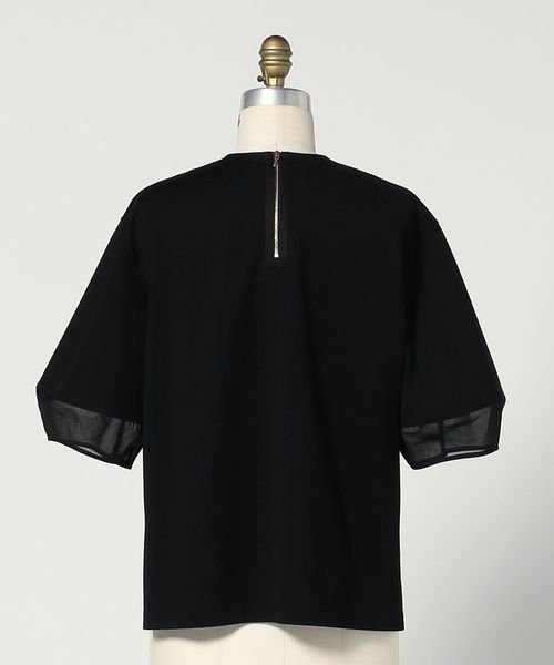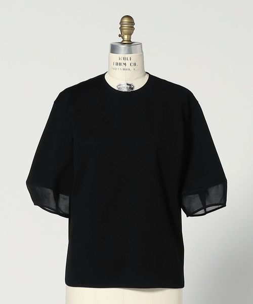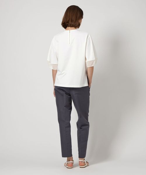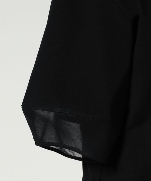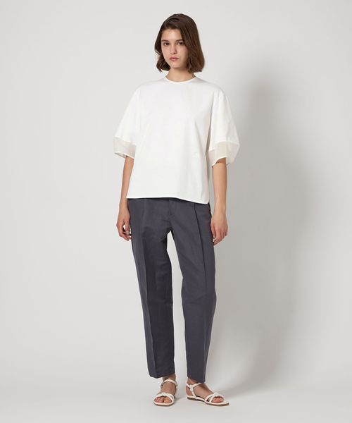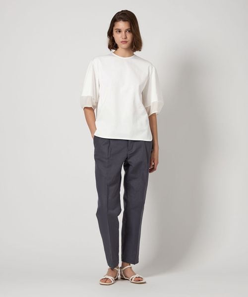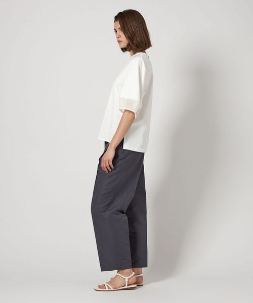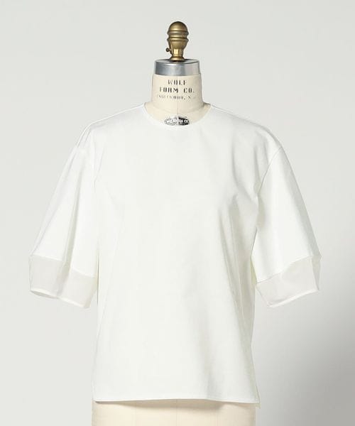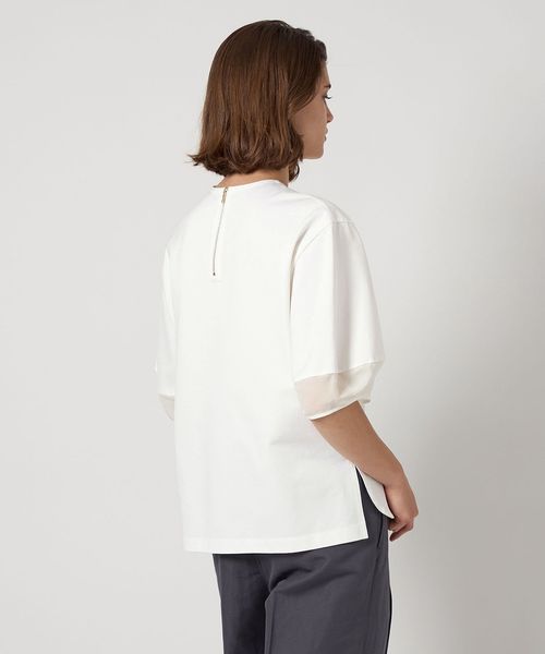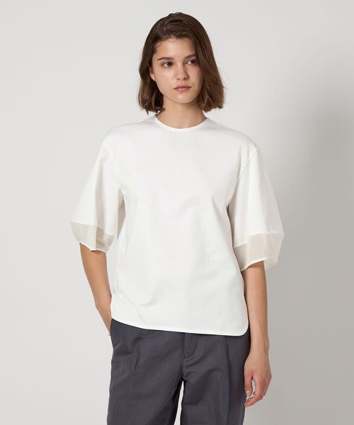 身頃は表面感が美しいコットン天竺素材、袖口部分はシアー感と軽やかさが特徴のコットンオーガンジー素材を使用。