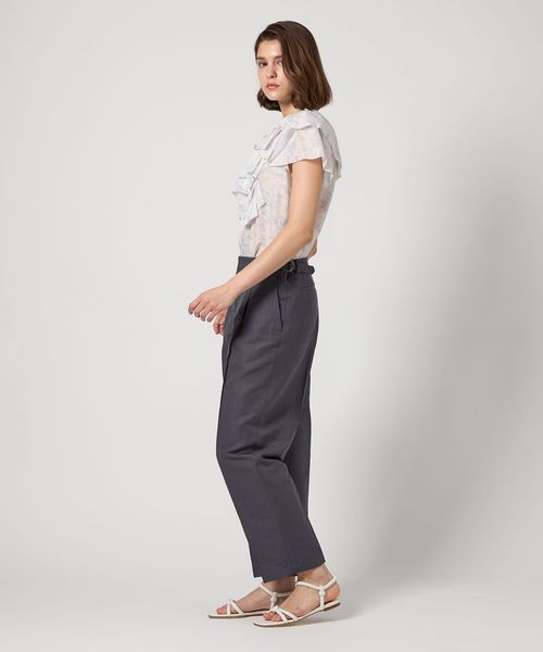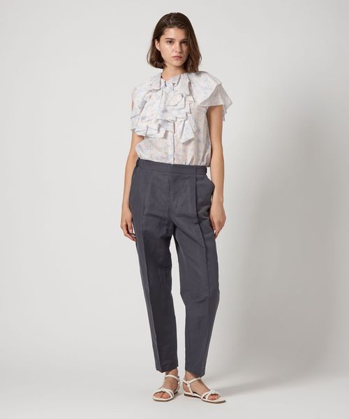 フロント衿部分に大胆に施したラッフルと繊細なフラワープリントが存在感ある一着。