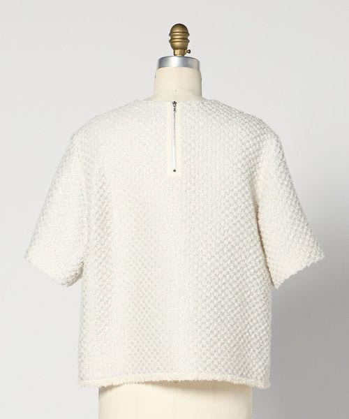 裾に身頃の羽根糸と同じ色の糸でフリンジを施したゆとり感のあるTシャツデザインのブラウス。
