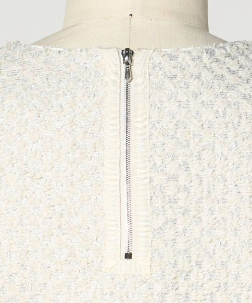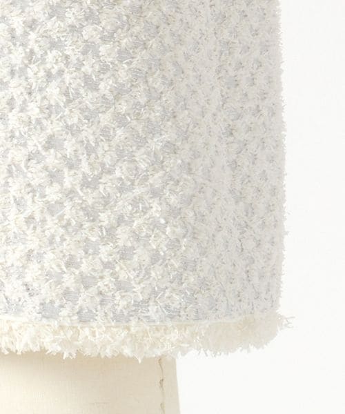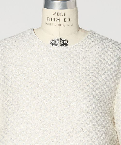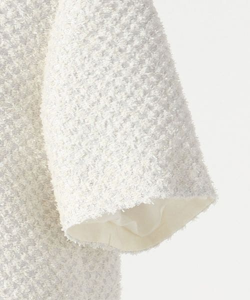 シンプルながらもしっかりとした素材感や、ツイードのようにも見える幾何柄が存在感あるスタイリングに仕上げます。