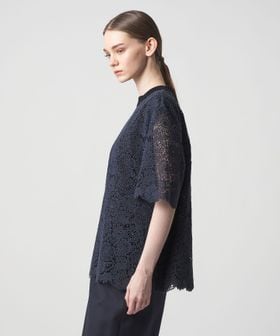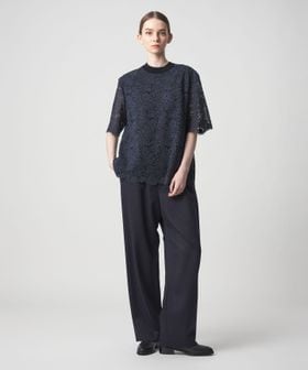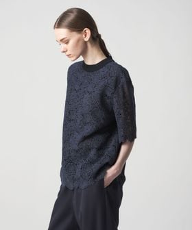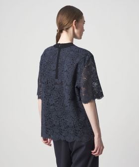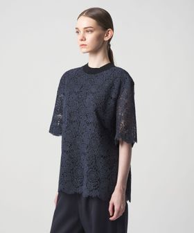 カジュアルなフォルムにレースの華やかさを融合させ、こなれた印象を演出するTシャツ型ブラウス。