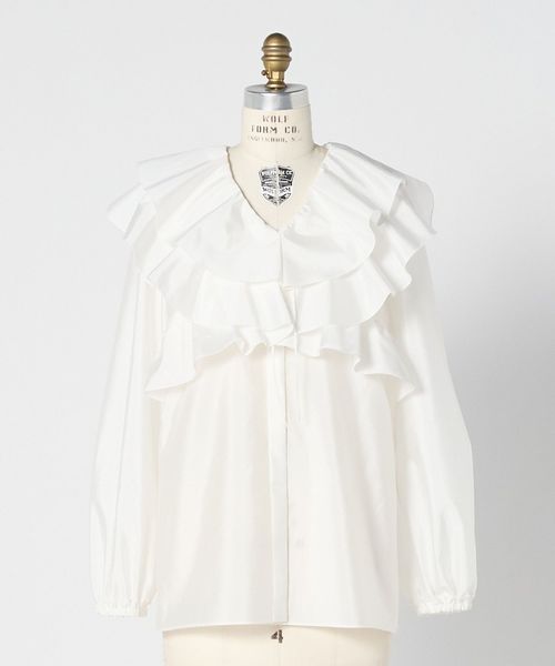 贅沢感あるボリュームのラッフルを衿元から見頃にかけてあしらったVネックブラウス。