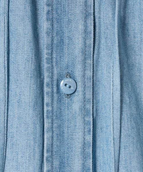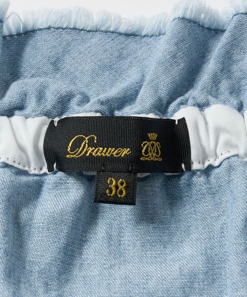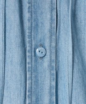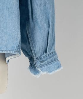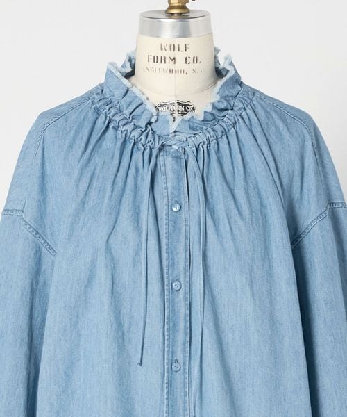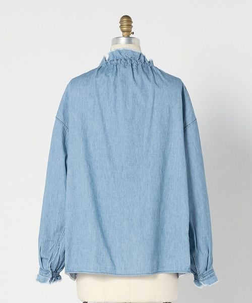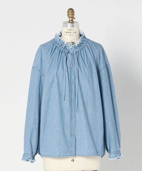 柔らかなデニム素材に、シャーリングを効かせた襟元と袖口のギャザーフリルが華やぎを添えるブラウス。