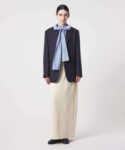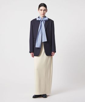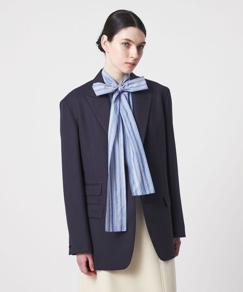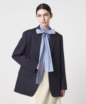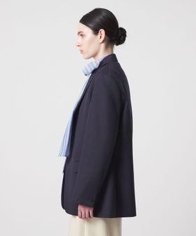 ハリのある素材を使用し、裏地は背抜き仕様で仕立てた軽やかさと存在感を兼ね備えた一着。