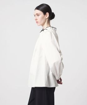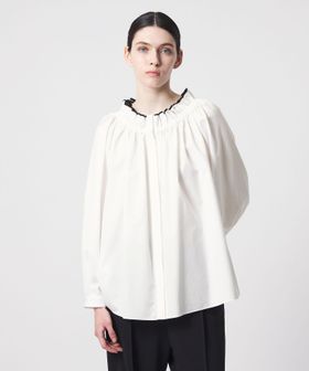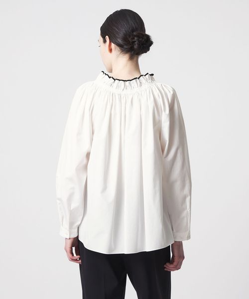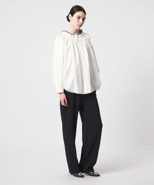 襟のギャザーとパイピングが華やかに映えるブラウス