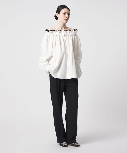襟ぐりにたっぷりとギャザーフリルを施した、オフショルダーのテントラインブラウス。