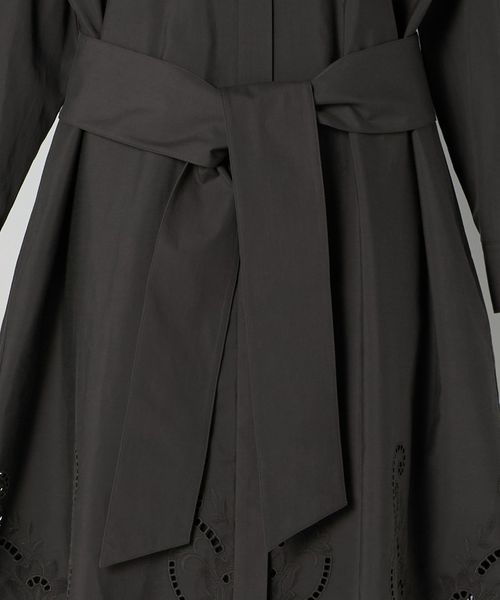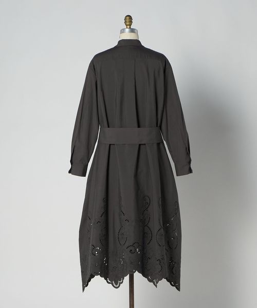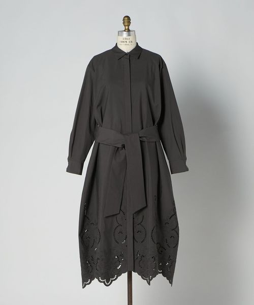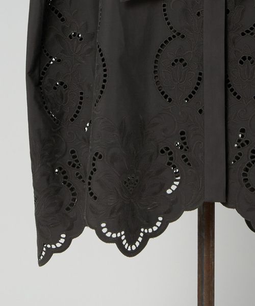 裾に大胆なレース刺繍を施したシャツワンピース。