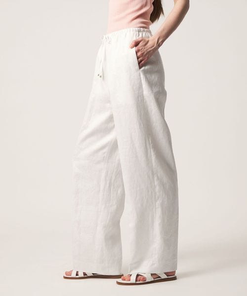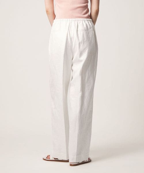 麻シルク素材ならではの涼やかな風合いと、ほのかな艶感が際立つホワイトカラーのドロストパンツ。