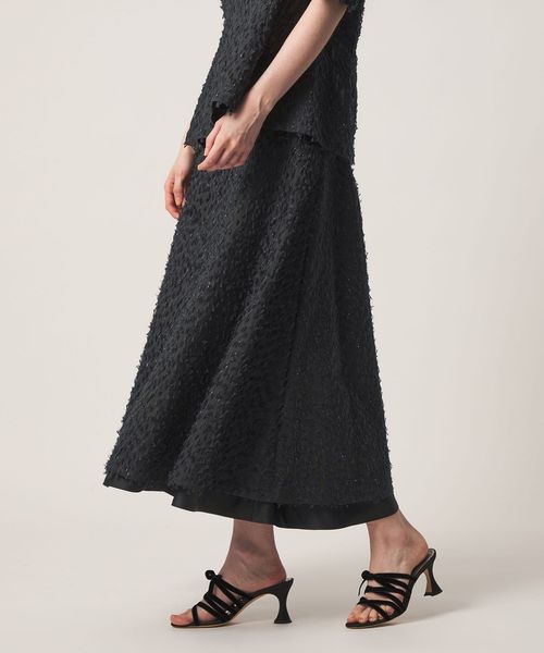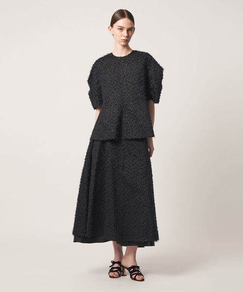 ブラックカラーの凛とした佇まいに、表情豊かなカットジャガードとさりげないラメが華やかさを添え、奥行きのある印象に。