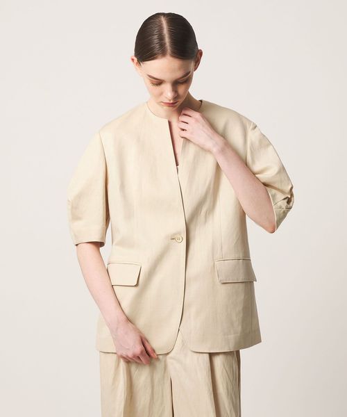 軽やかに羽織れるハーフスリーブのノーカラージャケット。
