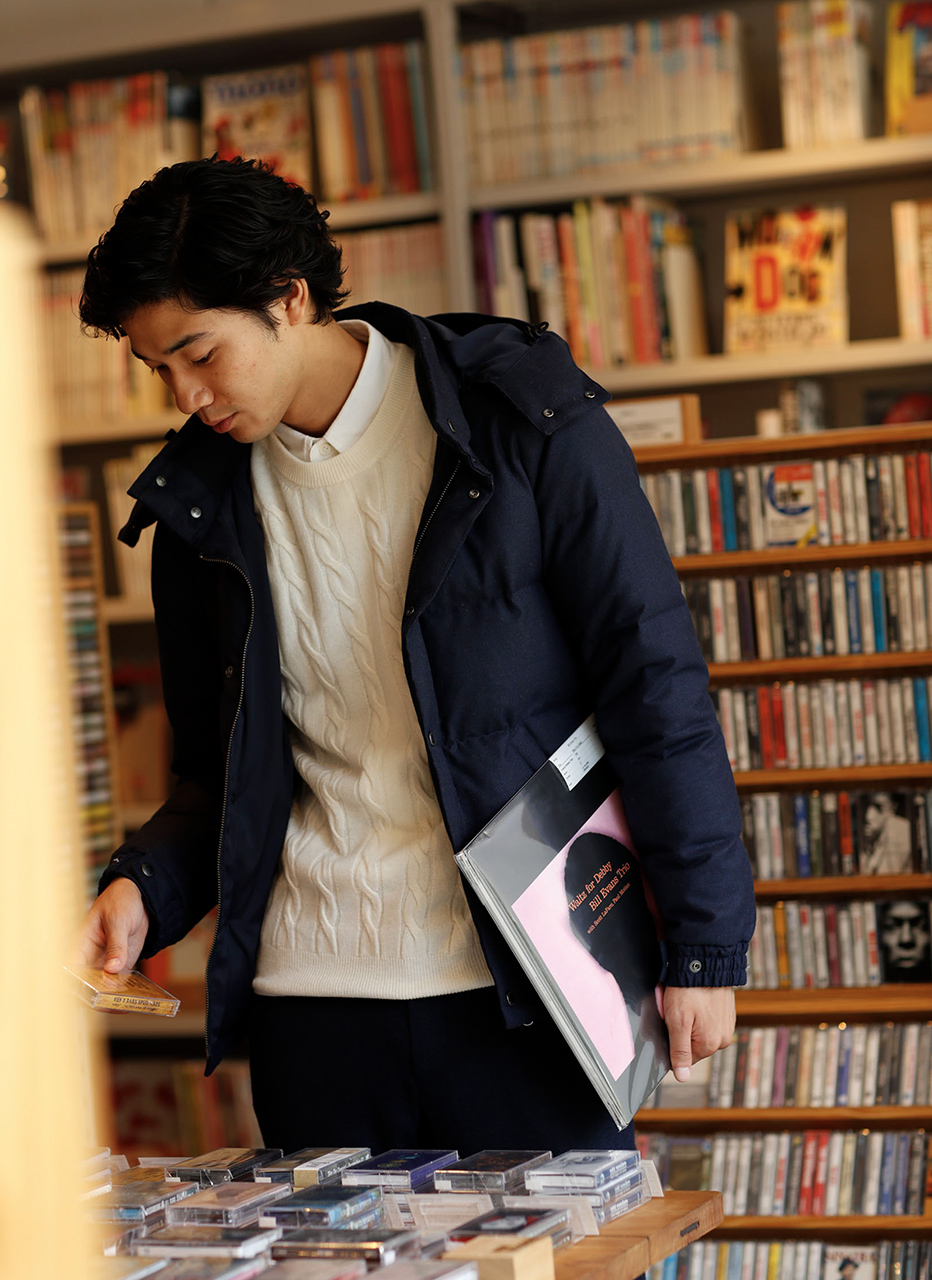 ウール×ポリエステルのサキソニー生地を使ったダウンジャケット。雰囲気が良く、撥水加工も施されているという優れものだ。深みのあるネイビーはやっぱり上品で、飽きのこないカラーなのだ。