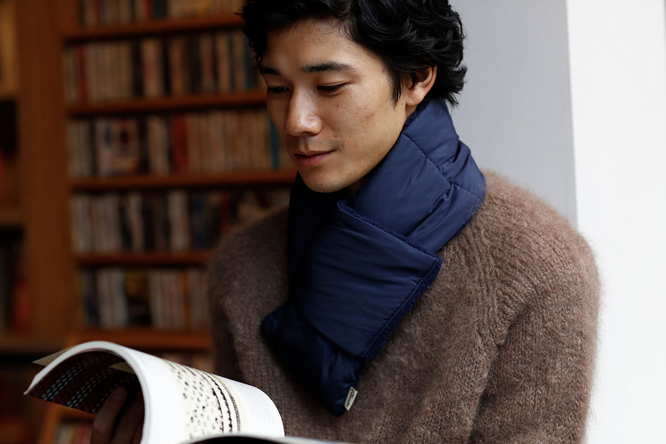 確かにネイビーのマフラーは地味に見えるかも。でもそれはウールの場合、じゃないかな。アウトドアライクな中わた入りのマフラーなら、程良いボリュームで存在感を発揮してくれる。