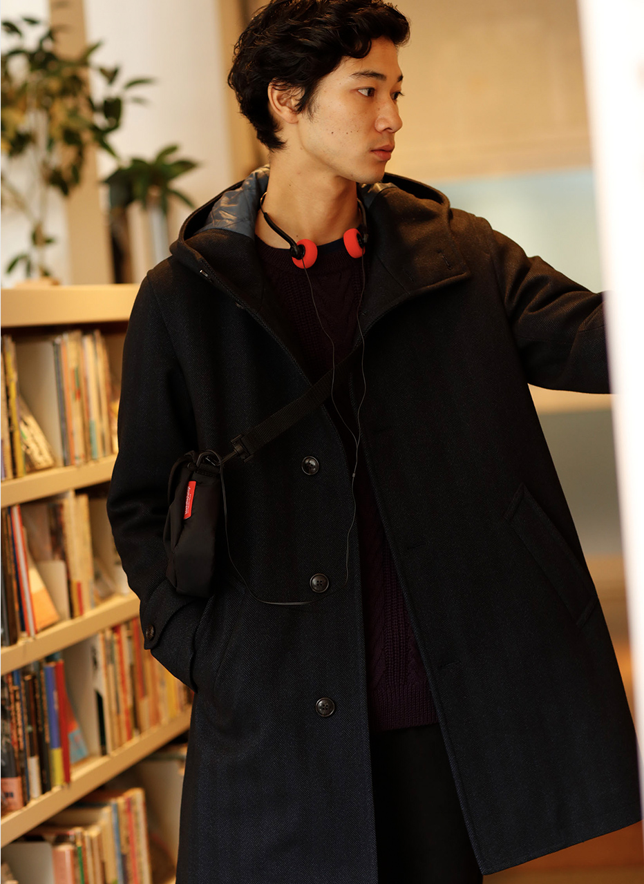 ツイードのような質感のフーデッドコートだが、実はポリエステル10 0%。ウールに比べ取り扱いが楽だから、アクティブな僕らには打ってつけ。裏地は中わた入りなので、真冬まで活躍してくれそう。